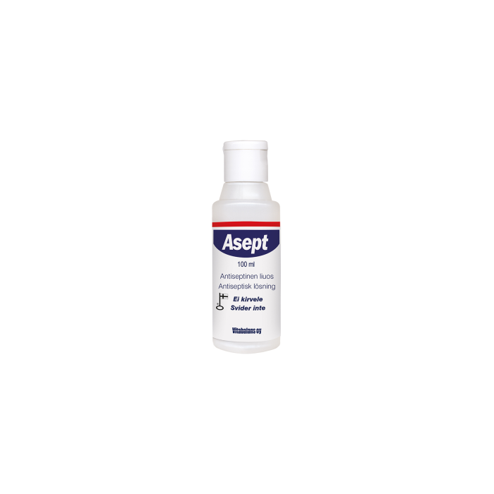 Asept puhdistaa ja desinfioi pienet haavat, naarmut sekä ihovauriot. Antiseptinen liuos sopii myös hyönteisten puremien ja auringon polttaman ihon puhdistukseen. Asept on miellyttävä käyttää, sillä se ei kirvele iholla. Sopii koko perheelle.